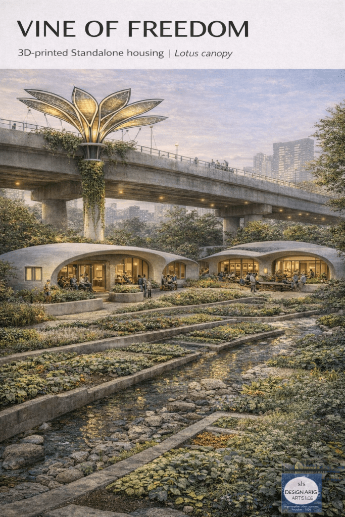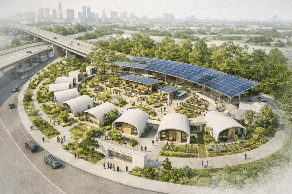 Vine of Freedom reframes freeway infrastructure as civic ground — transforming residual underpass space into energy-producing, climate-adaptive, community-supporting public infrastructure.